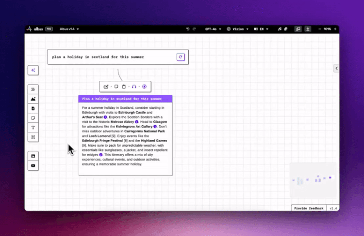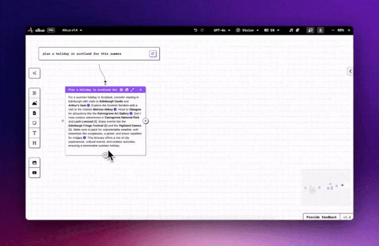 Albus is great for boosting your self-learning, research, and creative sessions. With all the best in class generative AI technologies on an infinite canvas you’ve got the most powerful generative AI toolset in one place!