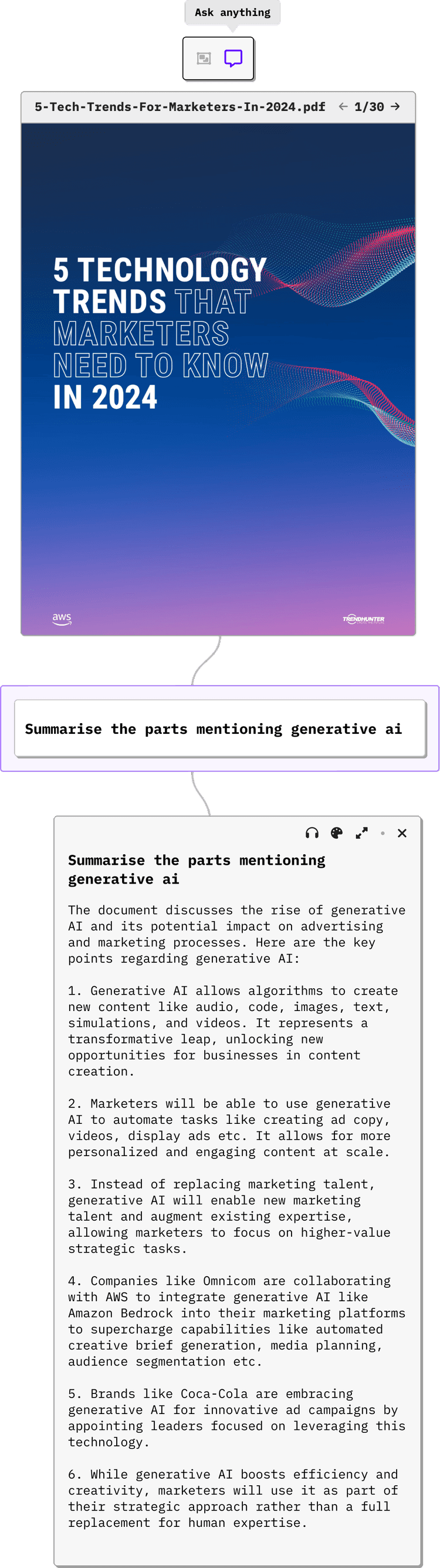 When working with complex reports and articles, asking direct questions and getting spot-on responses is gold. Upload the documents and use the little chat icon to ask for insights and answers.