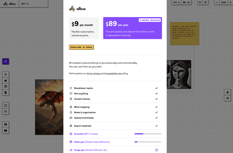 Harness the power of visual canvas powered by advanced AI models. There is no need for separate subscriptions and shuttling between apps, just Albus, with no fuss.