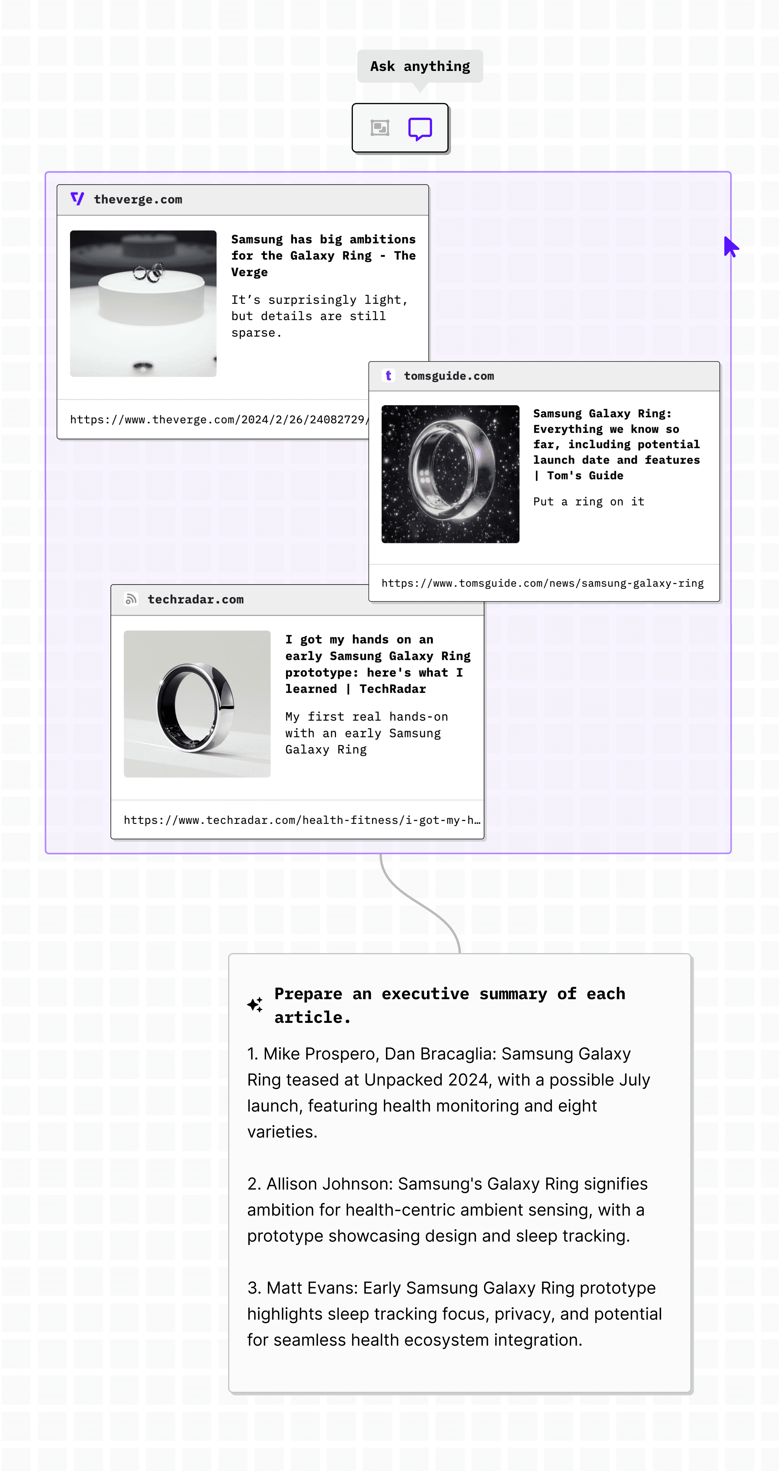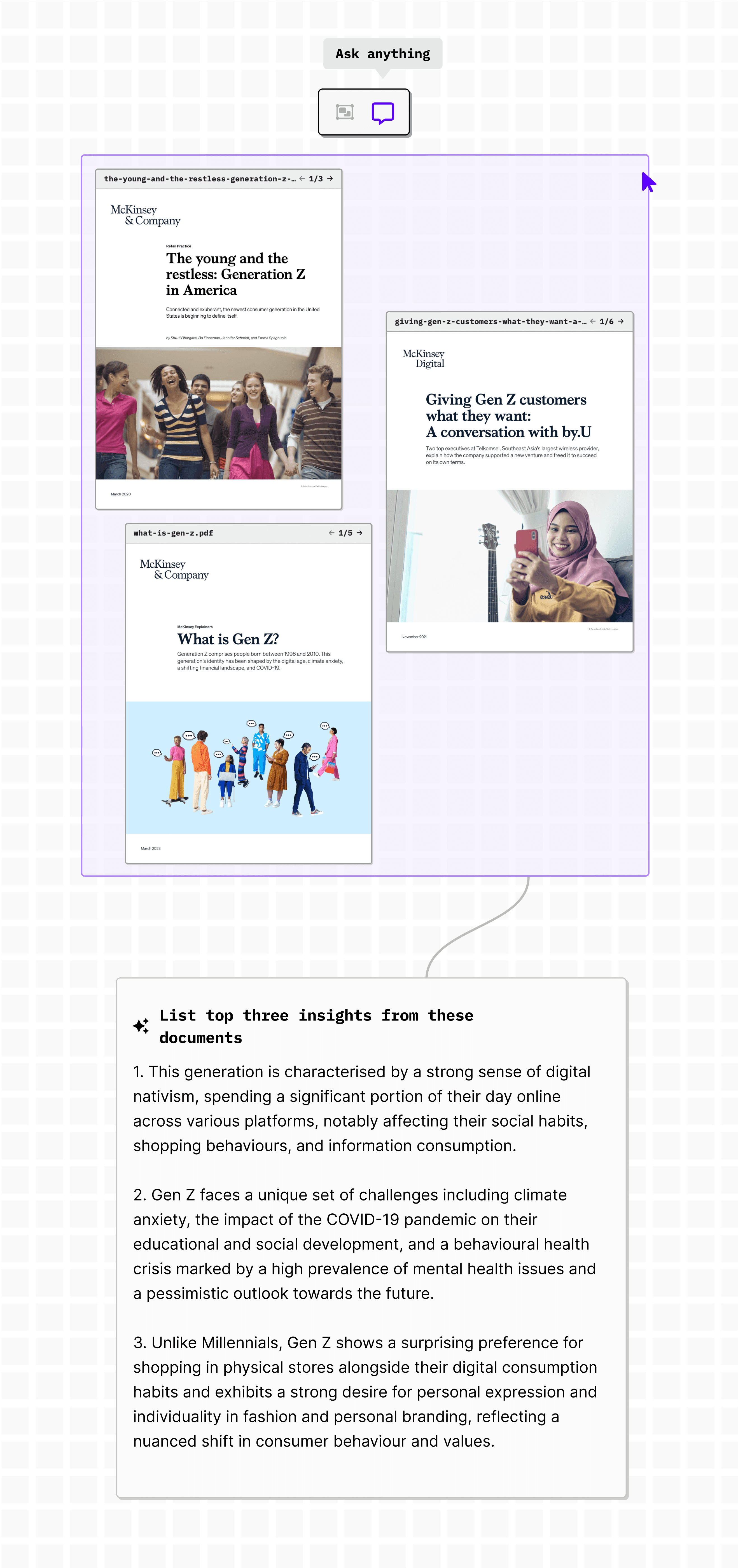 Select multiple PDF files, pick ‘Ask Anything’ on the menu, and tell what you want to know. You can ask for a summary or common points mentioned across all. Depending on the content you provide, you can get many different insights.