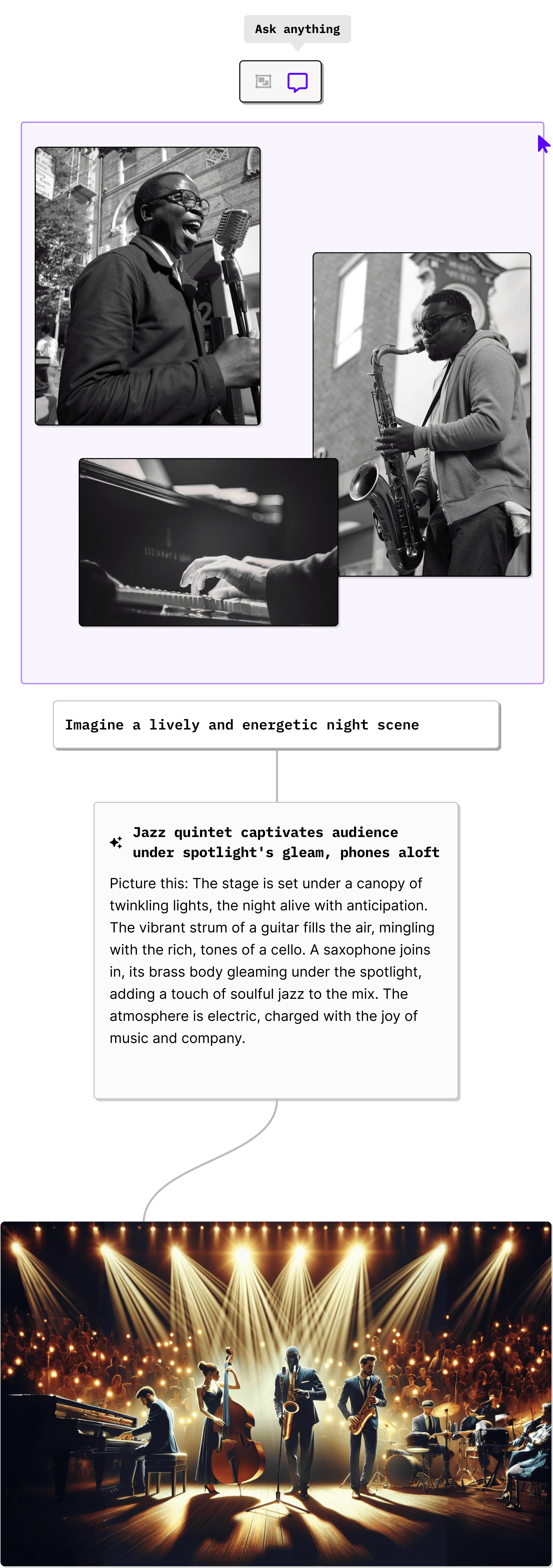 Albus can interpret multiple images placed on a board. You can ask for a short story, a common theme, or a brand-new scene based on the overall essence.Select all the images you want to include and click ‘Ask Anything’ on the menu to tell Albus your wish.