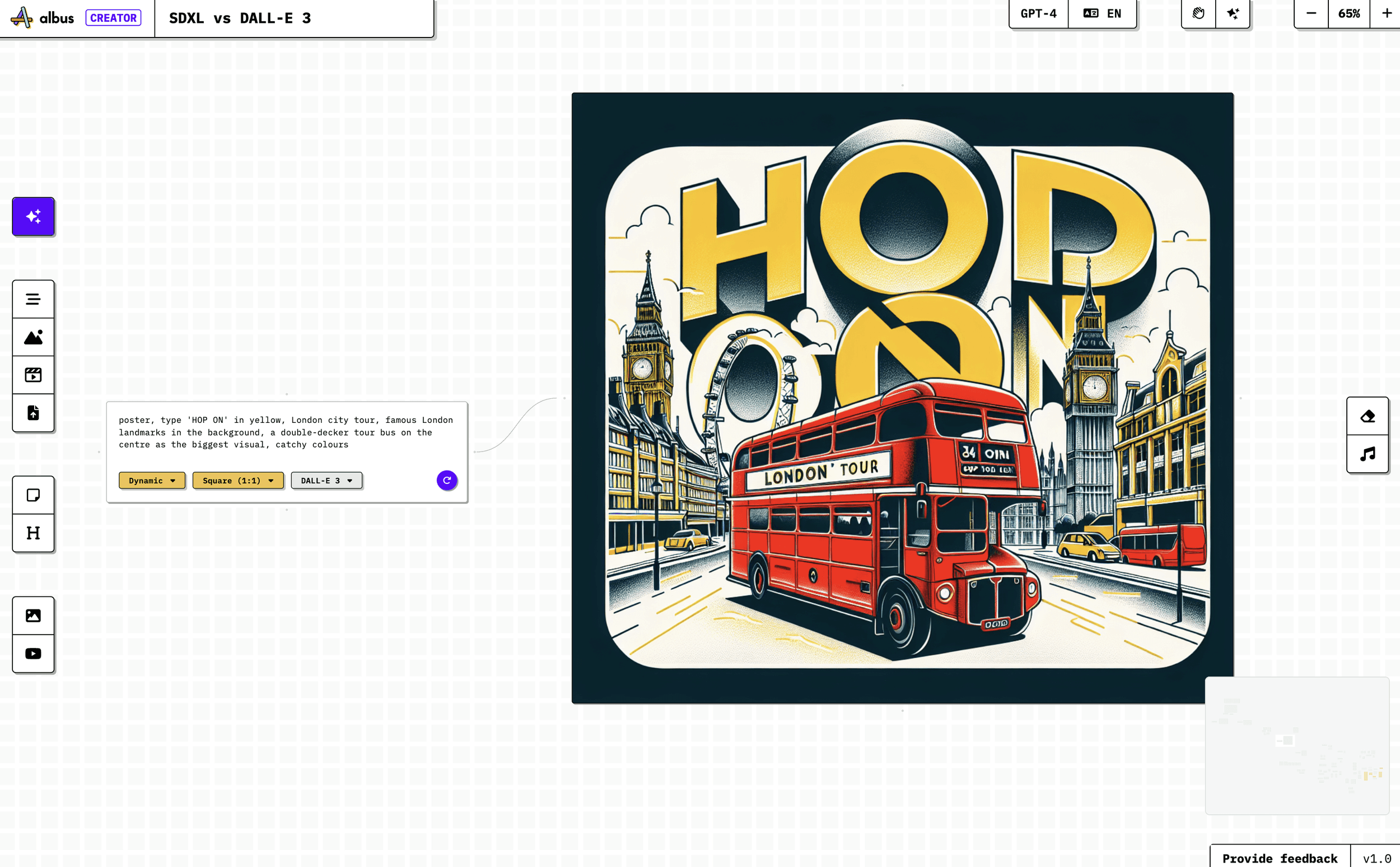 Prompt: 'Poster, type 'HOP ON' in yellow, London city tour, famous London landmarks in the background, a double-decker tour bus on the centre as the biggest visual, catchy colours.’