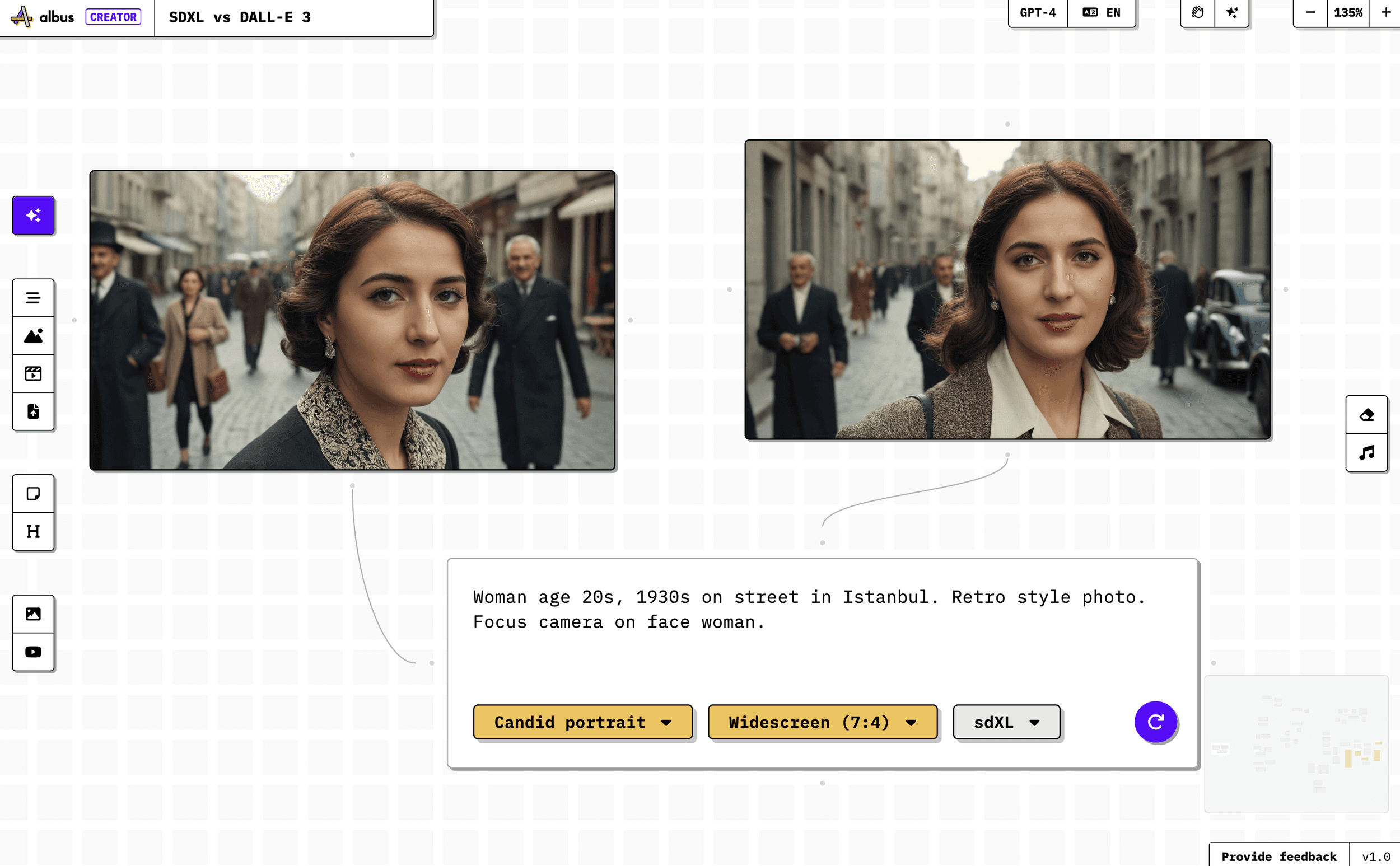 Prompt: ‘Woman age 20s, 1930s on street in Istanbul. Retro style photo. Focus camera on face woman.’