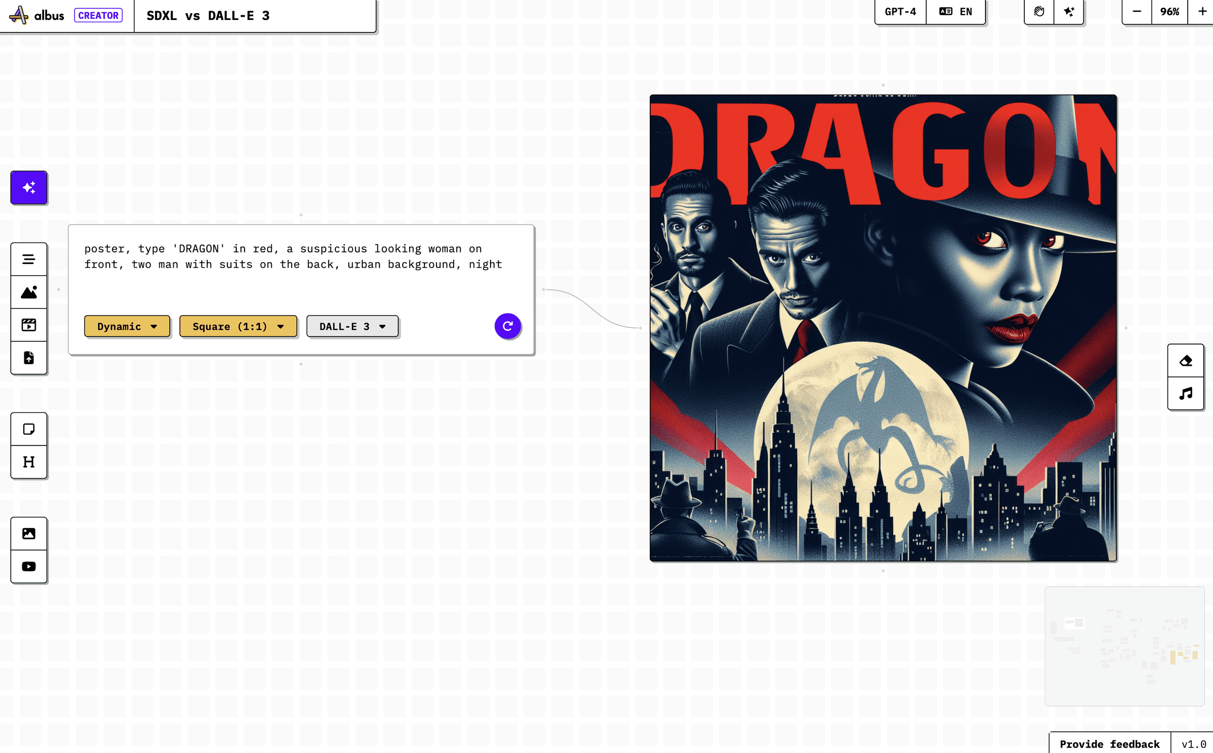 Prompt: ‘Poster, type 'DRAGON' in red, a suspicious looking woman on front, two man with suits on the back, urban background, night.’