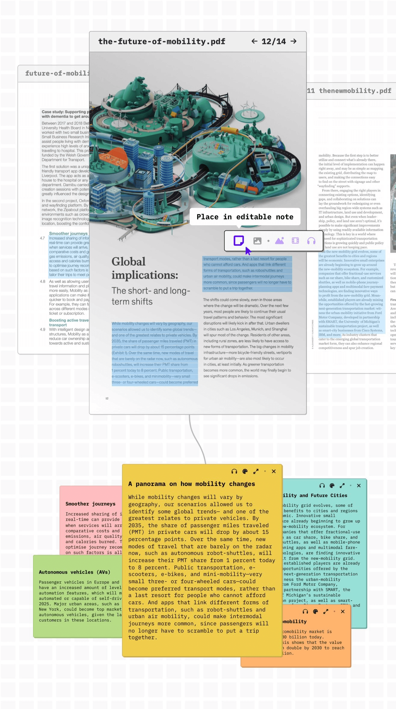 One of the best parts of working on a canvas is the productive space, which lets you have a bird's-eye view and speculate about ideas. While working with PDFs, highlight the parts that grab your attention and place them into quick notes.