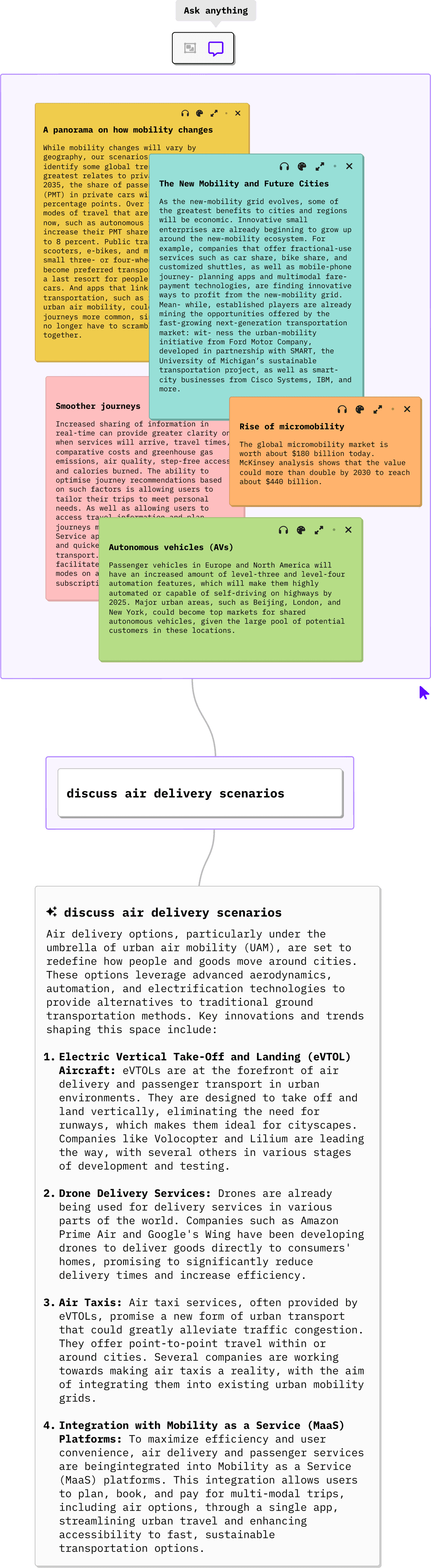 While ideas pile up, new connections and perspectives emerge. Select all your excerpts and use ‘Ask Anything’ to see your mind map on a larger scale and understand other aspects.