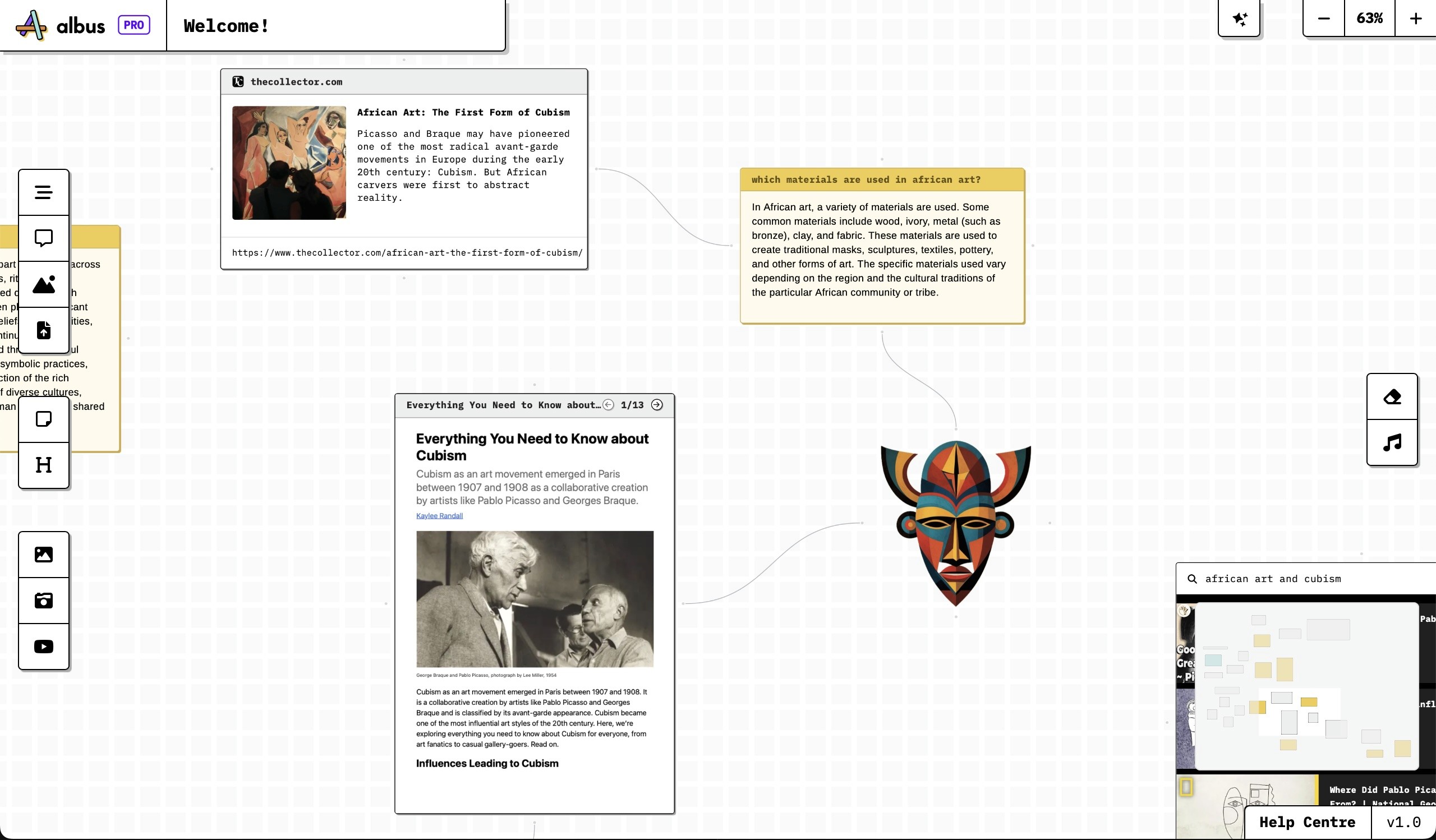 Albus creates a new content block when you requested an action, such as asking a question, or want to listen an audio narration of a piece of text you highlighted. A new block is always borns attached to its ancestor, so while you work on a board, a contextual mind map generates on its own automatically. It's a good way to develop your train of thought, or present your work.